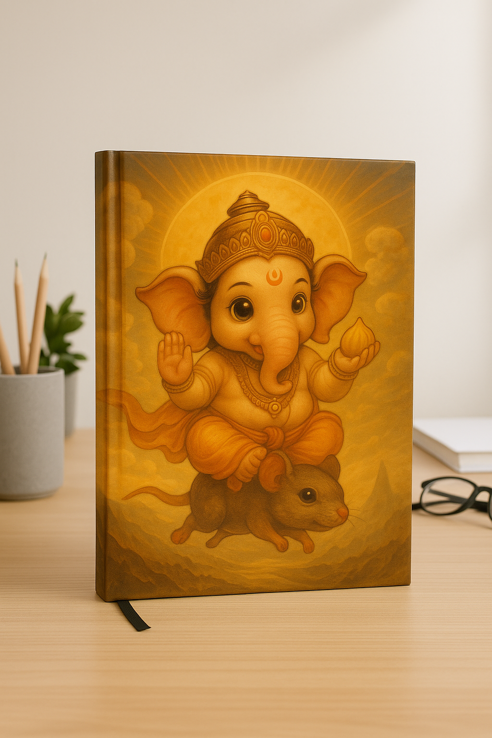 Experience divine inspiration with this Ganesha Riding Mouse Notebook, featuring an adorable artwork of Lord Ganesha seated on Mushakraj, his loyal vahana. Surrounded by a golden aura, this notebook symbolizes wisdom, positivity, and devotion. Available in Hardcover and Softcover, it’s perfect for journaling, devotional writing, sketching, or gifting.