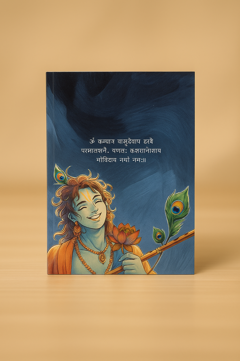 Bring joy and devotion into your daily writing with our Krishna Smiling with Lotus & Peacock Feather notebook. The vibrant artwork features a blissful Krishna holding a lotus, with a peacock feather beside Him, and a Sanskrit shloka in elegant white script. Designed for devotees, writers, and artists alike, this notebook combines spiritual elegance with premium functionality.