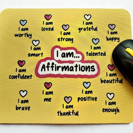 Fill your day with strength and self-belief with the Power Within Affirmations Mouse Pad. Featuring a bright yellow backdrop and a circle of uplifting “I am...” affirmations like “I am worthy,” “I am enough,” “I am brave,” this mouse pad acts as a daily reminder of your power and potential.